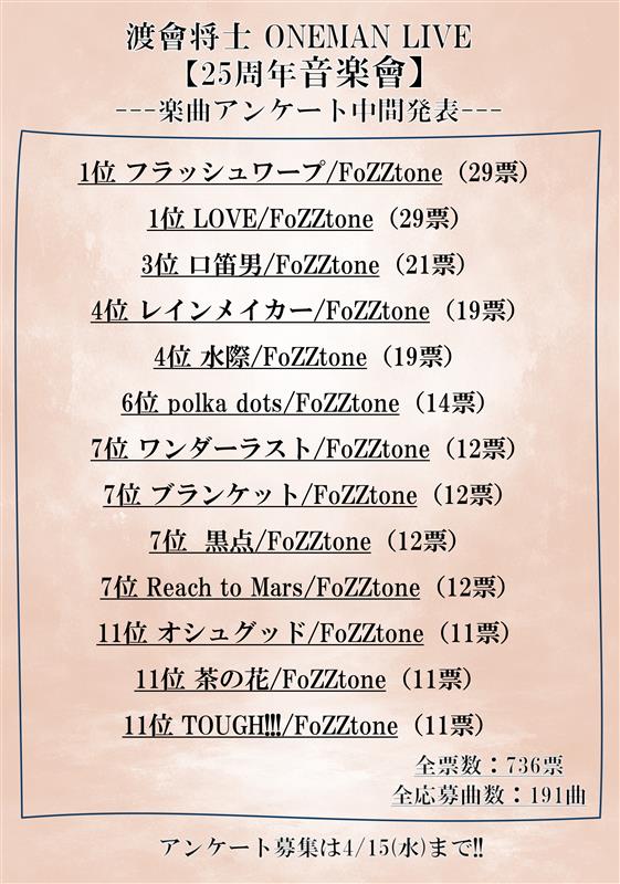 5/2(土)duo MUSIC EXCHANGEにて開催される、ワンマンライブ「渡會将士 25周年音楽會」で聴きたい楽曲のアンケートの中間結果を公開!